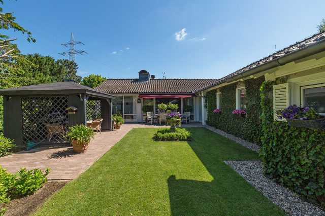 De tuin bij deze bungalow was grotendeels dichtgegroeid met grote bomen en veel klimop.