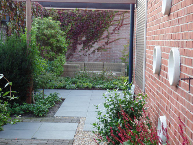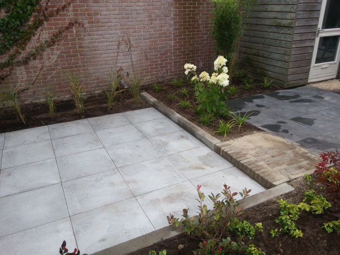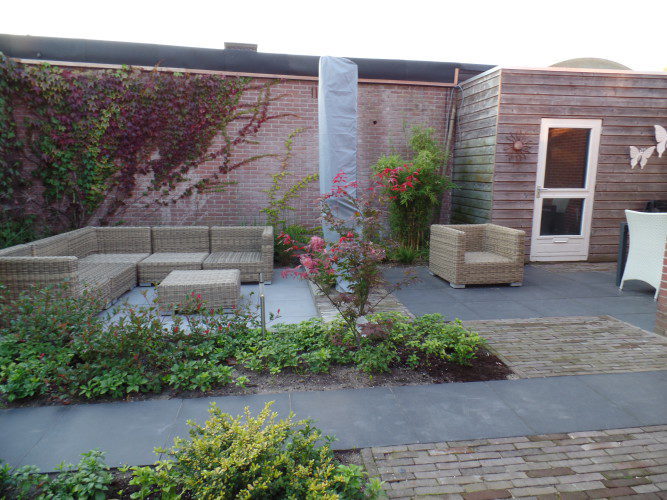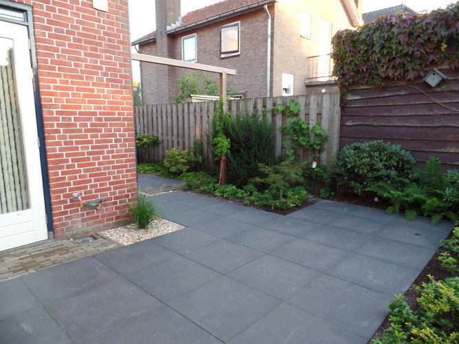 Deze combinatie van wensen is vertaald naar een onderhoud,s arme achtertuin.