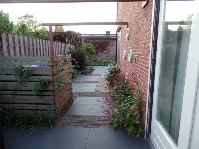 In de zijtuin zijn drie pergola’s gemaakt, om meer breedte en diepte te geven. Deze zijn beplant met klimplanten, net als de bestaande schutting op de erfscheiding.