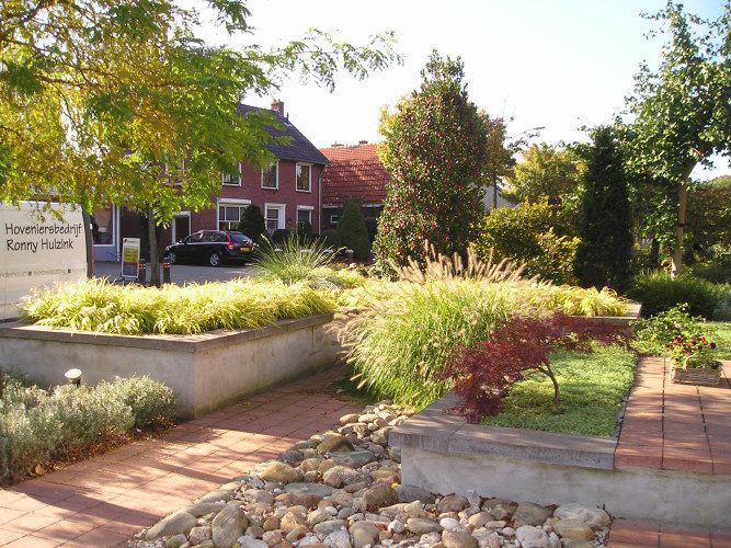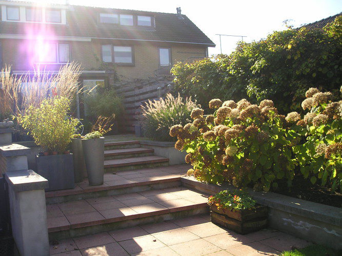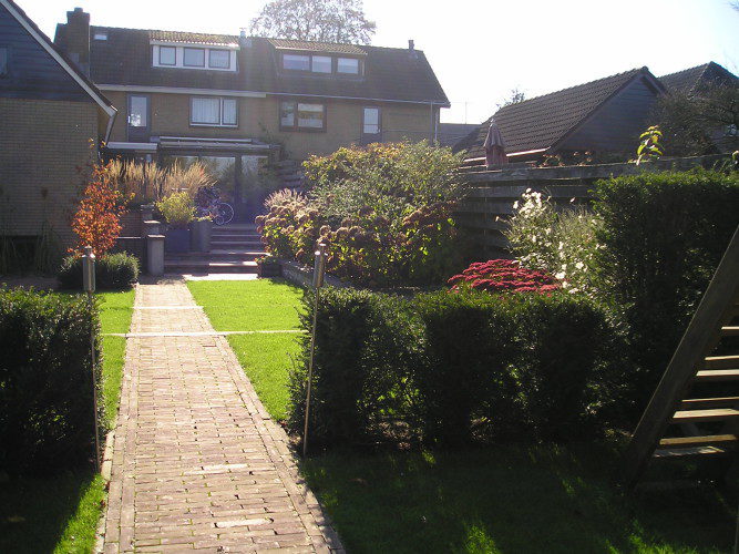 In twee fases zijn de voor- en achtertuin vernieuwd. In de achtertuin is het hoogteverschil van bijna een meter naadloos verwerkt in een brede trap. De trap loopt over in de tuin waar ook een speelplek voor kinderen is opgenomen. Gekozen is voor een symmetrische opbouw vanaf de trap. Veel groen en eenvoudig te onderhouden.